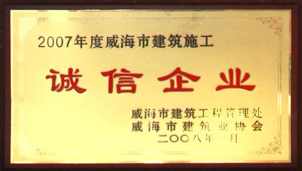 公司連續(xù)八年榮獲威海市“誠信開發(fā)企業(yè)”、“建筑施工誠信企業(yè)”,連續(xù)九年被評為威海市級“守合同重信用企業(yè)”,多次被評為威海市“市級文明單位”、“質(zhì)量管理先進企業(yè)”、 “安全管理先進企業(yè)”,乳山市“優(yōu)秀企業(yè)”、“先進民營企業(yè)”、“納稅明星企業(yè)”,在社會上逐步樹立了誠信、穩(wěn)健的企業(yè)形象。